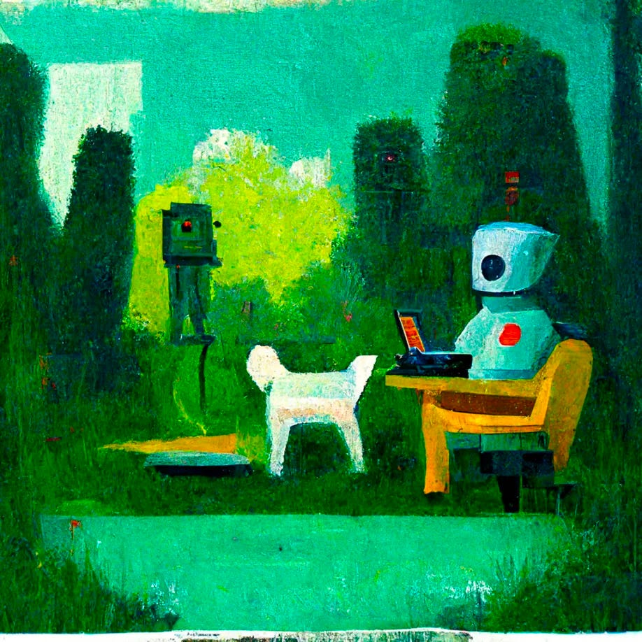 In layman’s terms, it’s an AI program that can generate some output content, such as text, image, video, speech, or code from some input. For example, I was able to generate the picture below by typing ‘A robot writing on a computer with a dog, sitting in a garden, green, oil painting’ in Midjourney, a text-to-image AI program